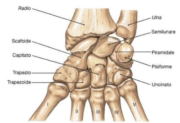 Il polso è la cerniera tra avambraccio e mano: comprende otto ossa carpali organizzate in due file e in rapporto con radio e ulna. La fila prossimale riunisce scafoide, semilunare, piramidale (triquetro) e pisiforme; la distale trapezio, trapezoide, capitato e uncinato.