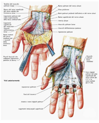 Al palmo, il retinacolo dei flessori chiude il tunnel carpale, attraverso cui passano il nervo mediano e i tendini flessori.